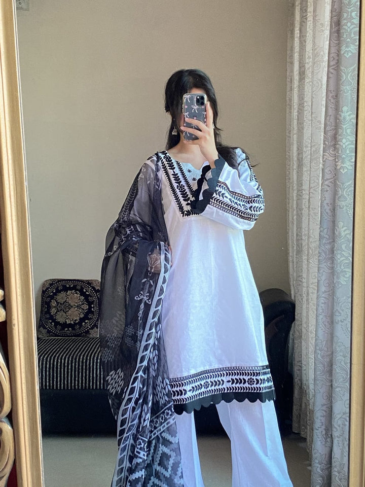 EMB SHIRT WITH LEASE WORK ON BOTH ARMS + SACLIP DAMAN WITH SACLIP PLAZO AND DIGITAL PRINTED SHAFFON DUPPATA